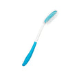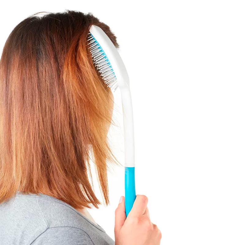 Den här hårborsten har ett extra långt skaft som är lätt böjt. Det långa skaftet gör att man undviker smärtsamma lyft med armen.