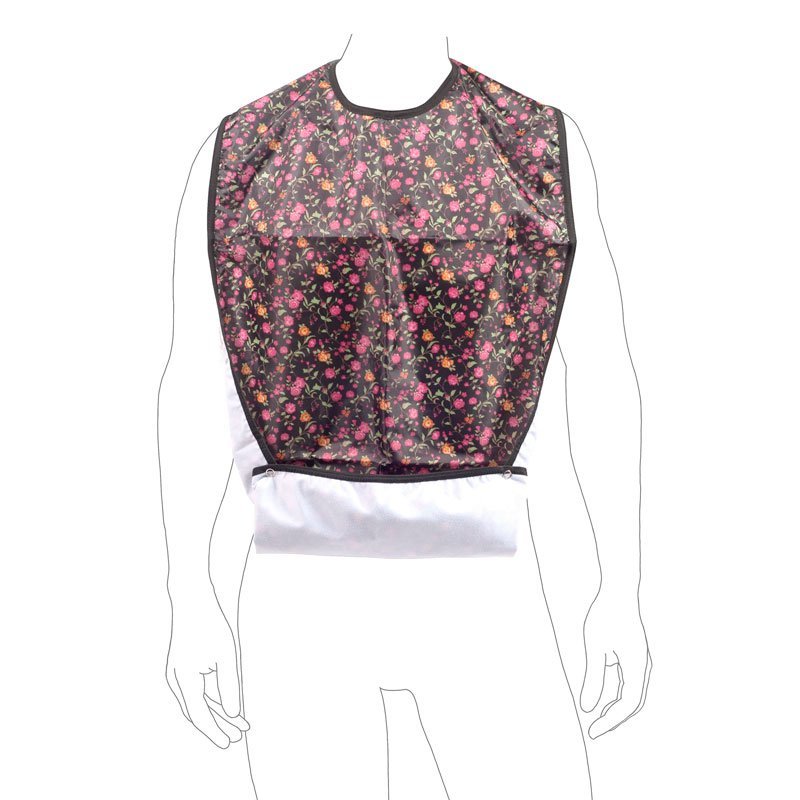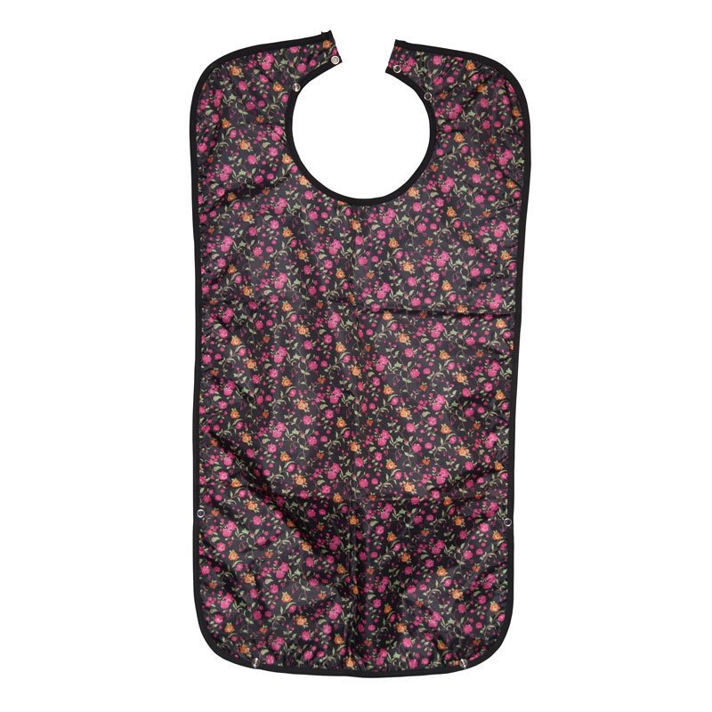 Blommig haklapp till vuxna med nickelfria tryckknappar. Haklappen är mjuk och behaglig med 100% vätsketätt laminering. Sköljs av under rinnande vatten eller tvättas i maskin i upp till 60°C.