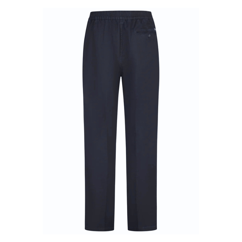 Mjuka och bekväma byxor från Brühl i en fin mörkblå färg. Byxorna är tillverkade av ett tjockare bomullstyg, vilket gör dem extra motståndskraftiga mot slitage och håller värmen väl.