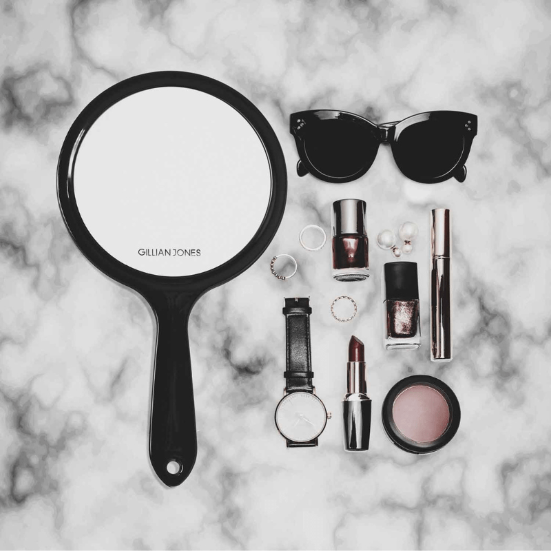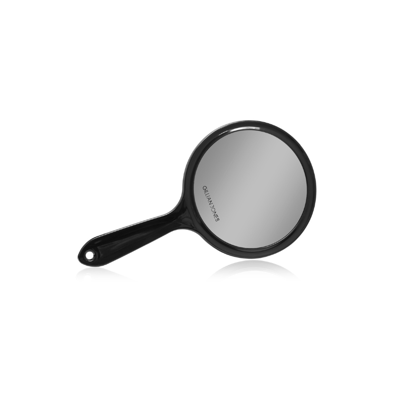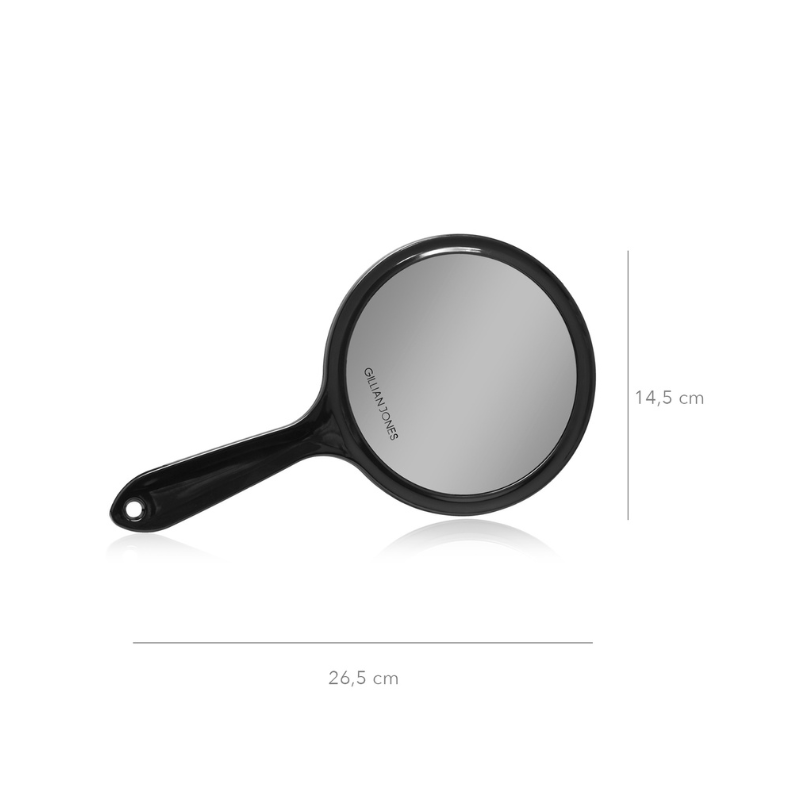 En snygg och praktisk dubbelsidig handspegel från Gillian Jones, tillverkad av 100 % återvunnen plast. Spegeln har äkta spegelglas med både vanlig förstoring (1:1) och 1,5x – perfekt för att korrigera smink och noggrann hudvård.