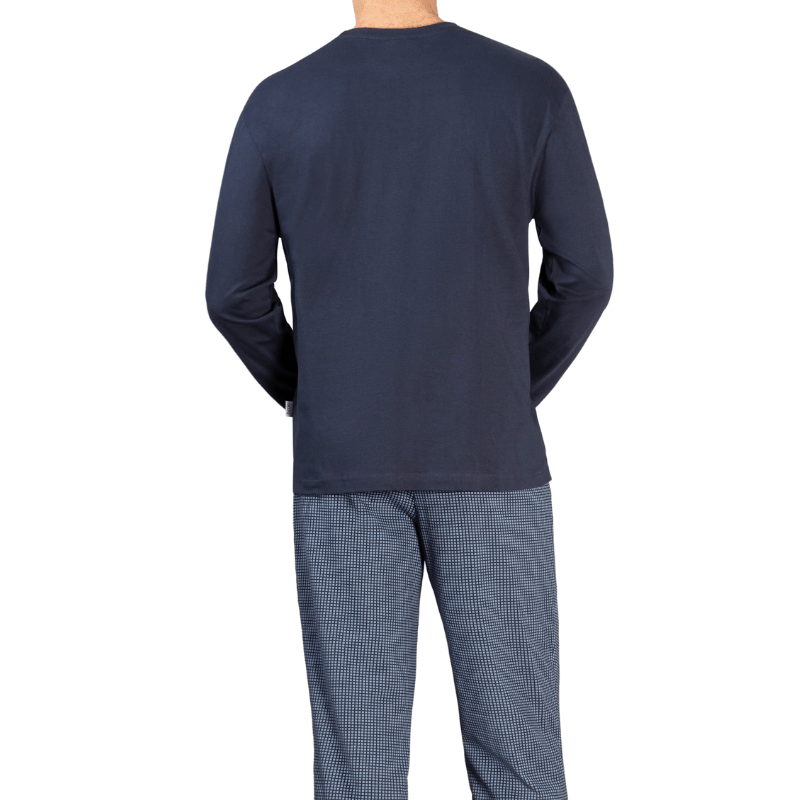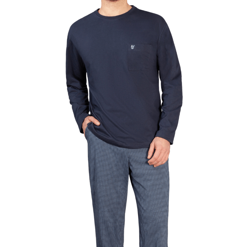 Upptäck den perfekta kombinationen av komfort och kvalitet med den här tvådelade pyjamasen från det välrenommerade märket Hajo. Setet består av en mörkblå långärmad tröja med rund hals och matchande byxor med ett diskret mönster i mjuk bomull – idealiskt för svala nätter eller en avslappnad kväll hemma.
