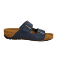 Klassisk mörkblå toffel i mjukt skinn med två breda, justerbara remmar. Toffeln är enkel att glida ner i och kan användas både utomhus och inomhus.