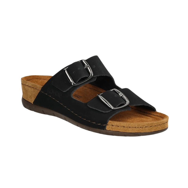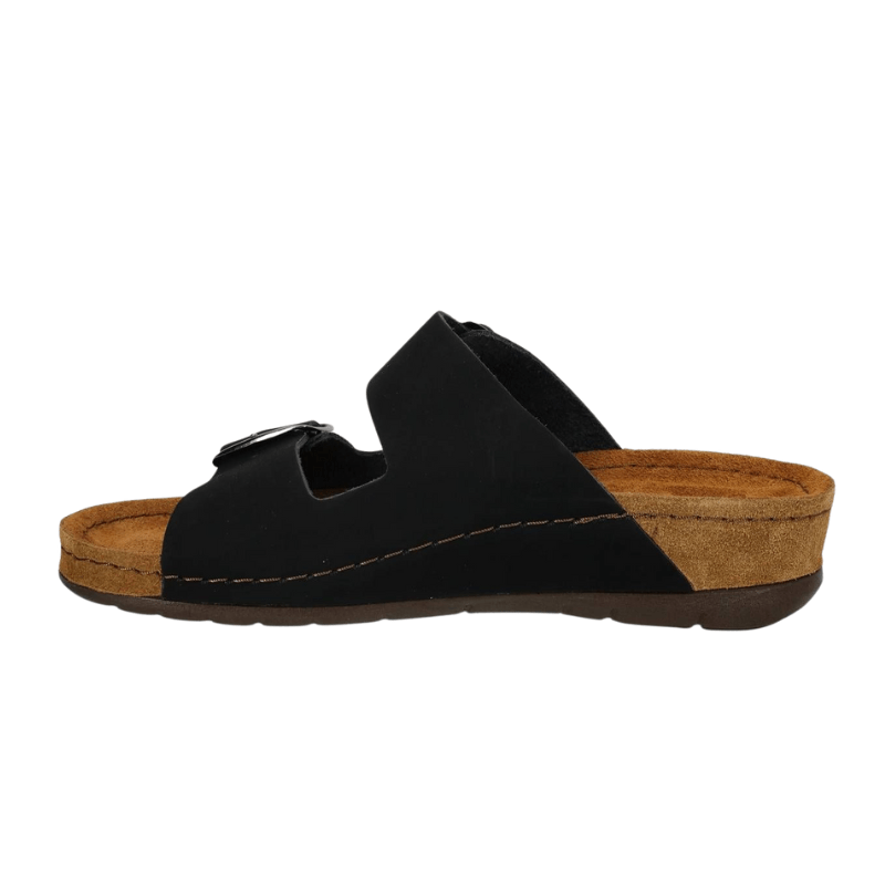 Klassisk svart damtoffel i mjukt läder med två breda, justerbara remmar. Toffeln är enkel att glida i och kan användas både ute och inne.