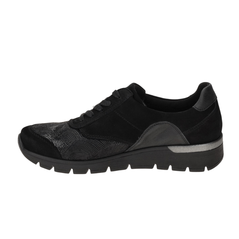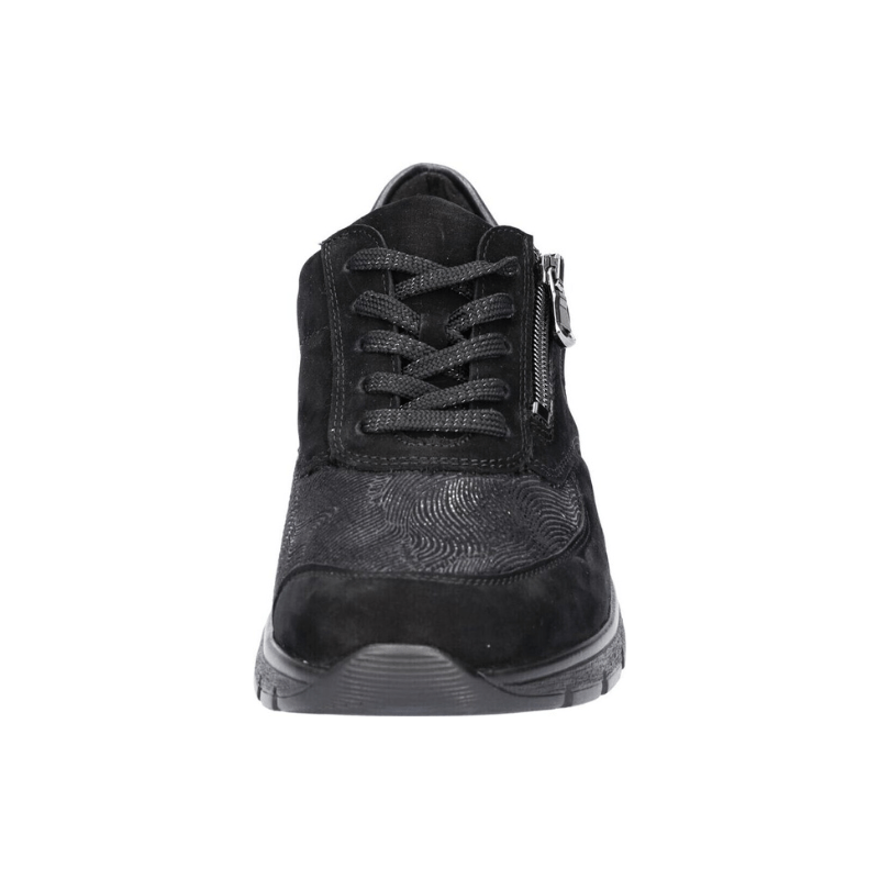 Klassisk och bekväm damsko från Waldläufer i svart läder kombinerat med stretchmaterial, vilket ger extra utrymme och anpassningsförmåga. Med både snörning och blixtlås är skon enkel att justera efter foten och snabb att ta på och av.