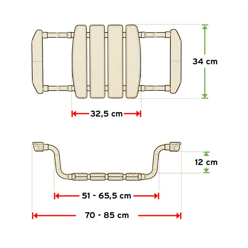 Duschstol som sänks ner i badkaret medan armstöden vilar på badkarets kanter. Duschstolen har en halkfri sits (32x34 cm) och passar till badkar med ett innermått på minst 65 cm, och yttermått mellan 70-80 cm. Armstöden fungerar samtidigt som grepp som du kan ta tag i när du stiger i och ur badkaret.