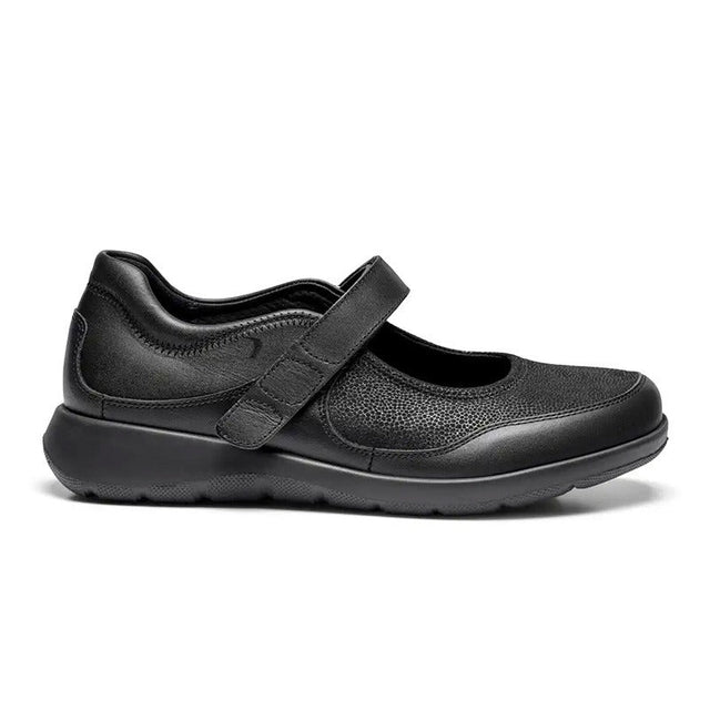 Elegant svart ballerina från New Feet i mjukt skinn. Skon är tillverkad i ett innovativt stretchmaterial som omedelbart anpassar sig efter fotens form och ger extra komfort. Den praktiska kardborrebandet över vristen möjliggör en perfekt passform och enkel justering.