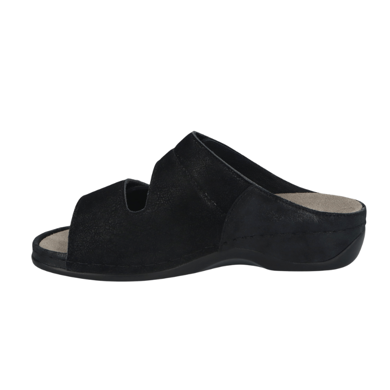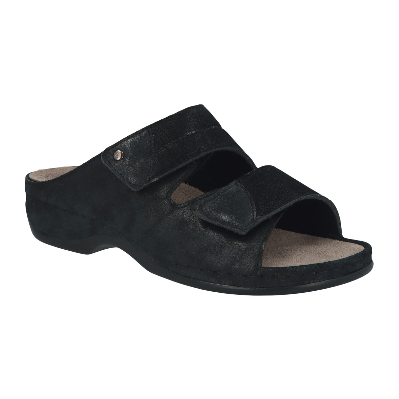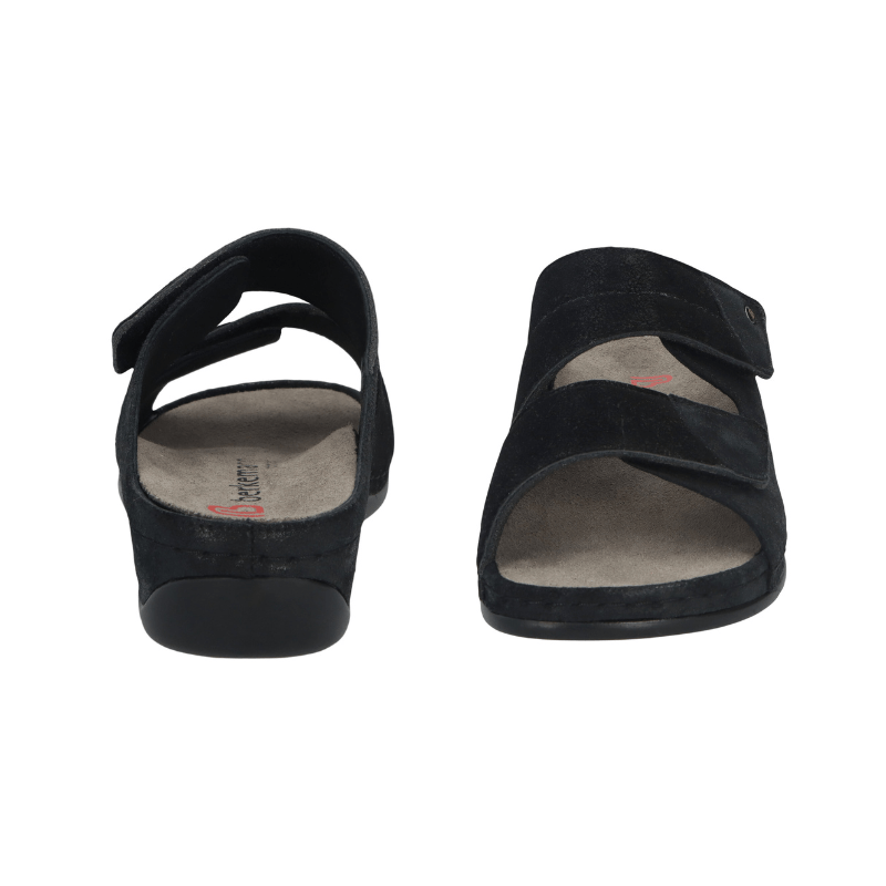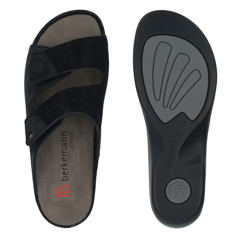 Superbekväm damsandal från Berkemann i svart mocka. Med två breda justerbara velcroremmar kan sandalen enkelt anpassas i bredden för att sitta stadigt på foten.