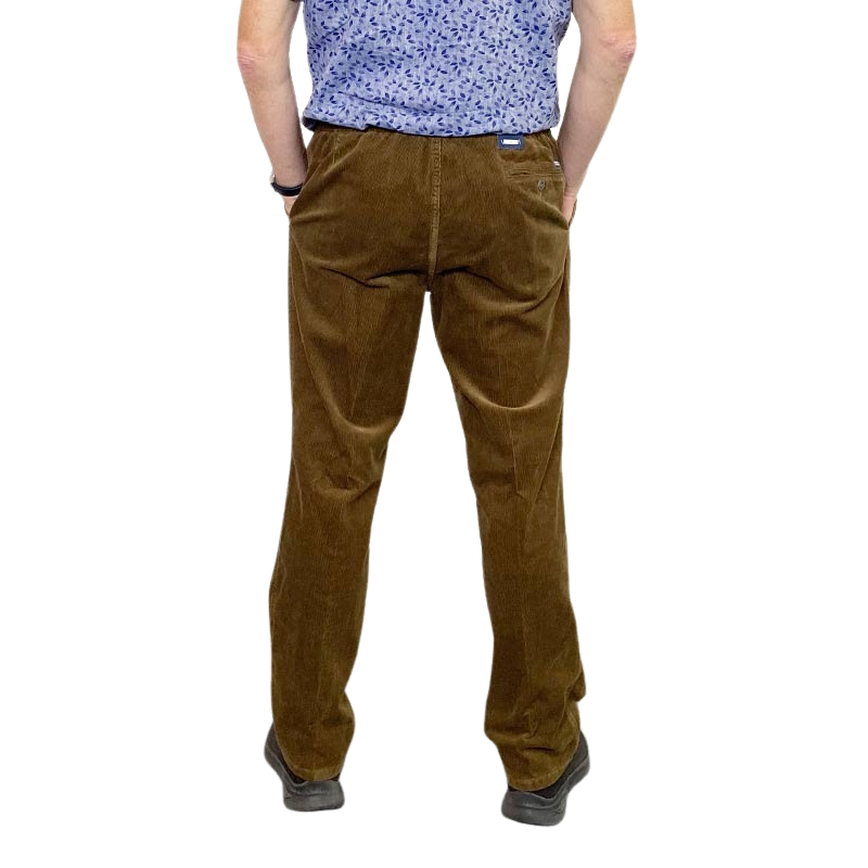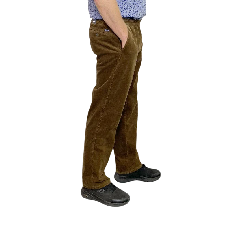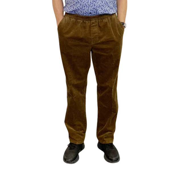 Härliga och mjuka byxor med 3 fickor i mjuk manchester från Brühl med resår i midjan i en varm brun färg.