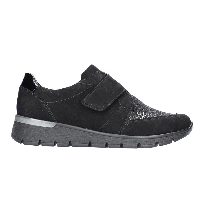Snygg Waldläufer damsko med extra bredd, vilket gör den särskilt lämplig för personer med känsliga fötter eller fotproblem, såsom hallux valgus eller hög vrist. Denna modell är svart med ett elegant djurprint på ovansidan. Trots den breda passformen är skons design utformad så att den visuellt ser smalare ut.