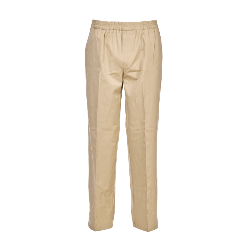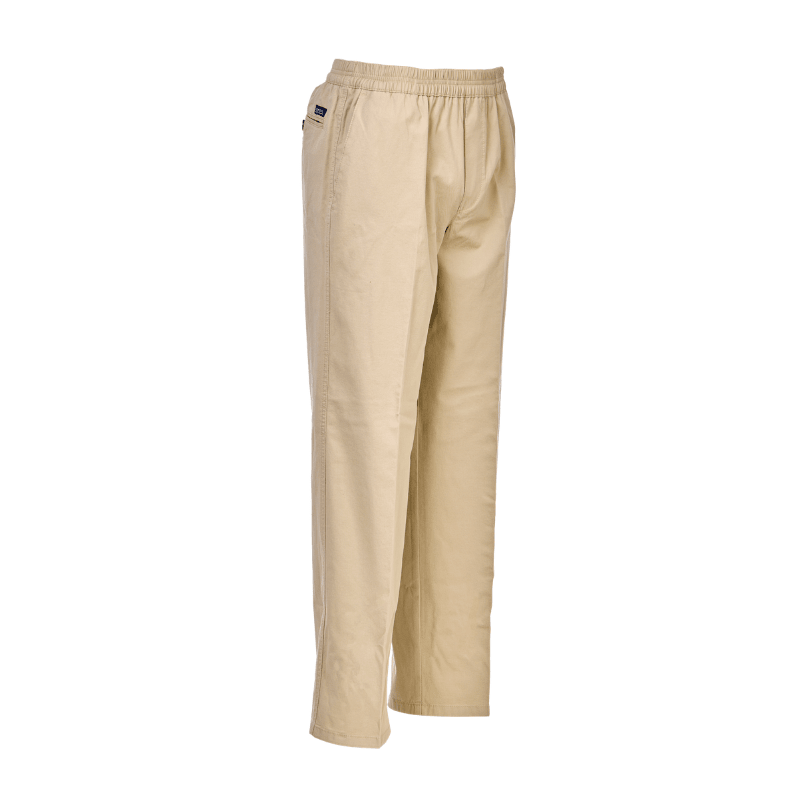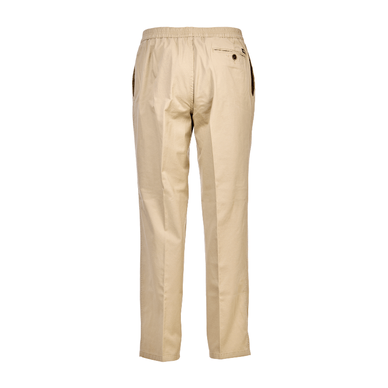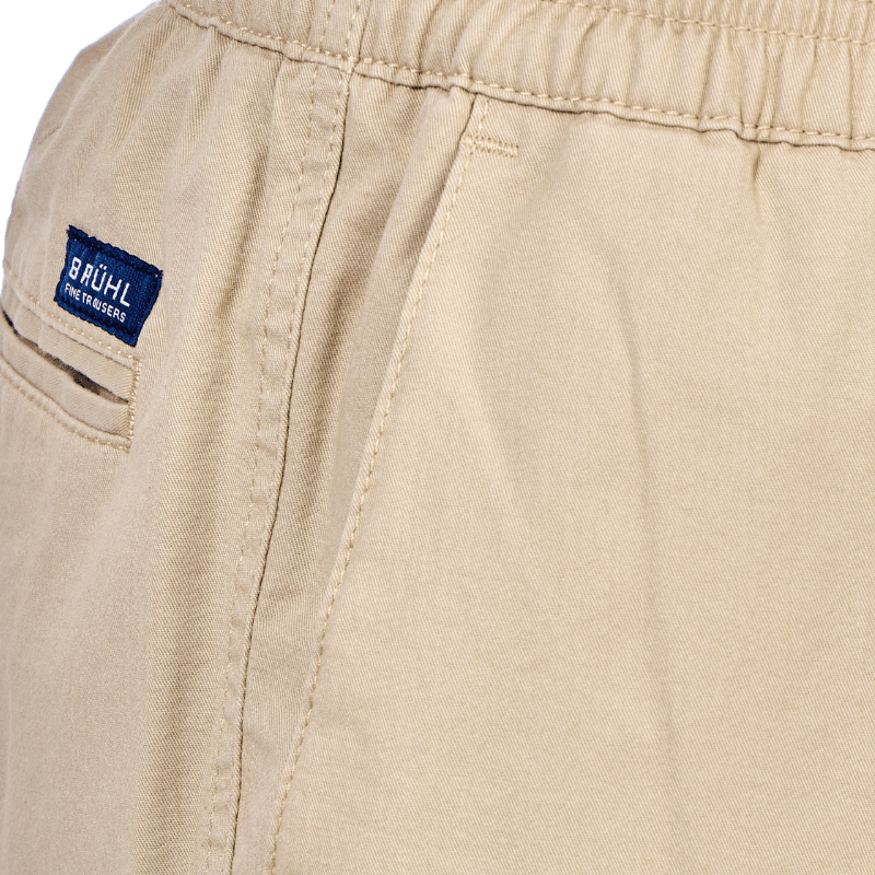 Lätta och klassiska beige byxor i mjukt tyg från Brühl med resår i midjan – utan knappar eller dragkedja. Byxorna har två djupa framfickor och en bakficka med knappstängning.