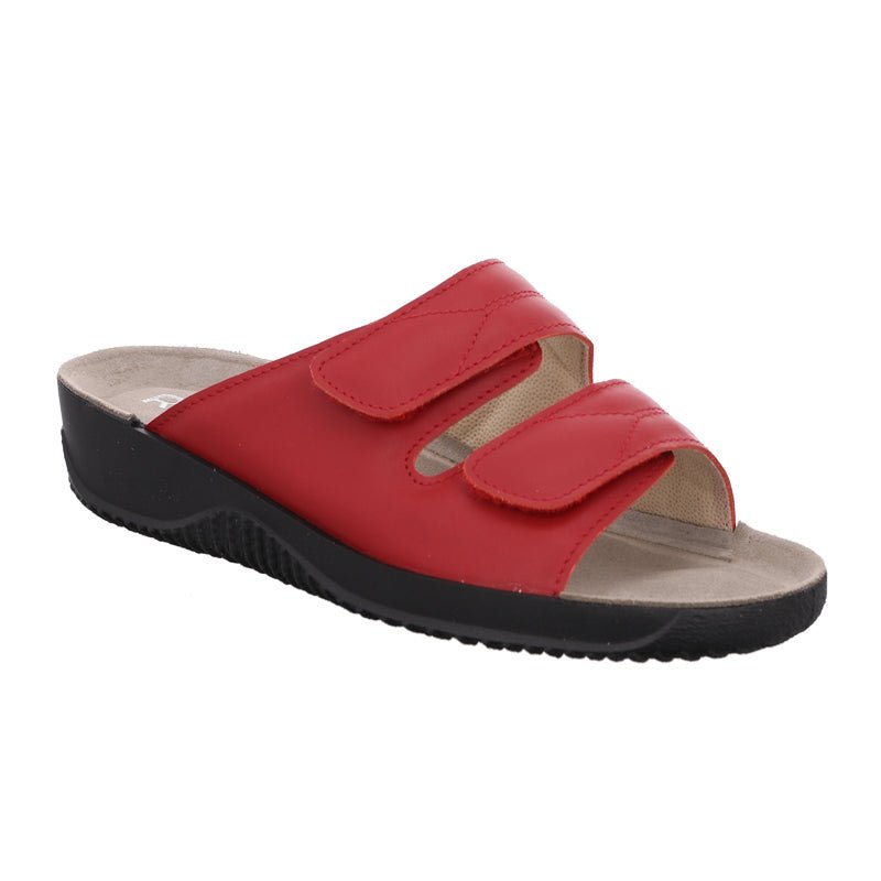 Snygg och praktisk sandal från Rohde i rött läder med två justerbara kardborreremmar. Sandalen fungerar bra som en sommarsandal men kan med fördel även användas som innesko.