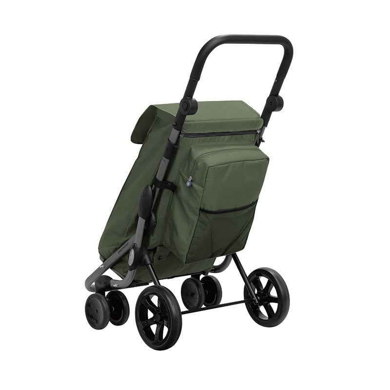 Go Plus är en stabil och exklusiv dramatenväska med en extra stor väska på 53,5 liter samt ett isolerat kylfack på 10 liter som håller dina varor fräscha hela vägen hem. Väskan har fyra hjul, där bakhjulen är större, vilket gör den mycket stabil – även på ojämnt underlag – och gör att du kan skjuta den framför dig som extra stöd.