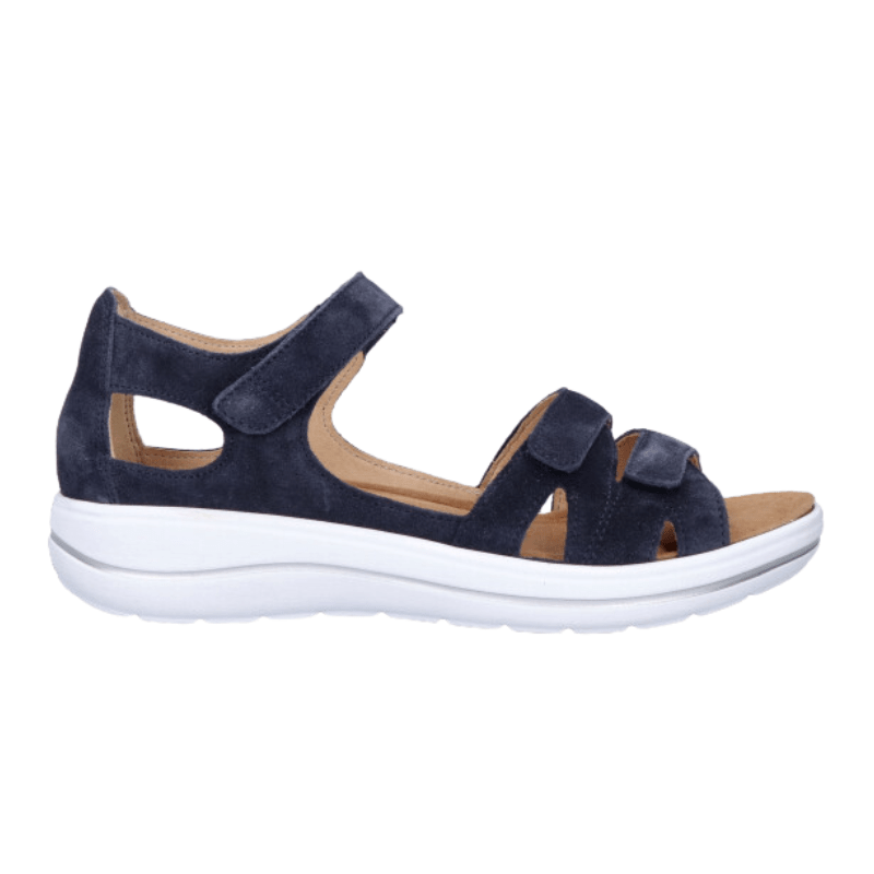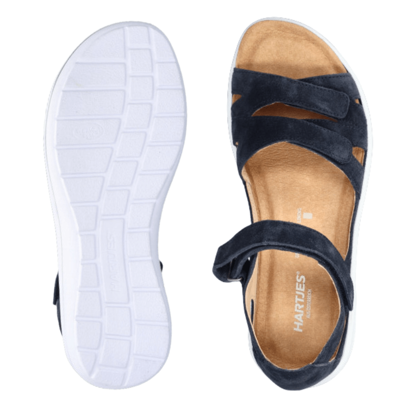 Mörkblå damsandal från Hartjes i mjuk mocka med tre justerbara kardborreband som säkerställer optimal passform utan tryck.