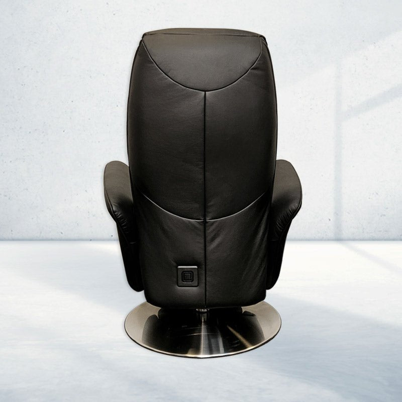 Fåtöljen är klädd i svart LongLife 18-läder av högsta kvalitet—slitstarkt, andningsbart och enkelt att underhålla. Du kan komplettera med ett vårdset för lädermöbler.