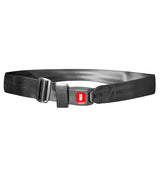 Svart säkerhetsbälte/höftbälte med insytt metallås. Bältet är lämpligt för att t.ex. hålla fast användaren i rullstolen.