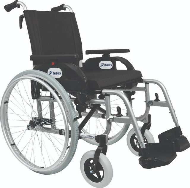 Sammanslagbar Dolphin rullstol från Mobilex i aluminium/stål – en lättviktsrullstol i elegant grå/svart design.