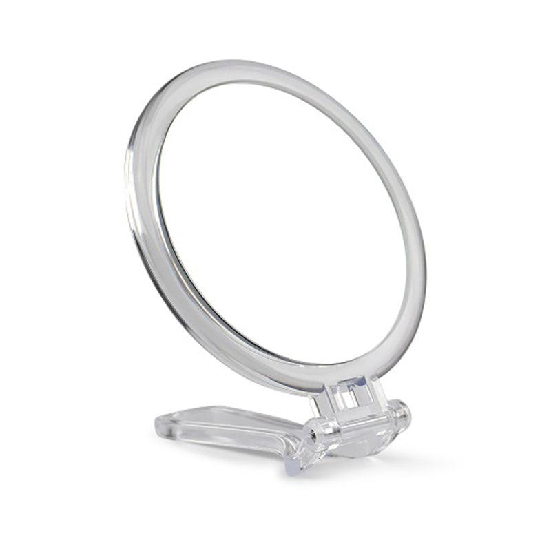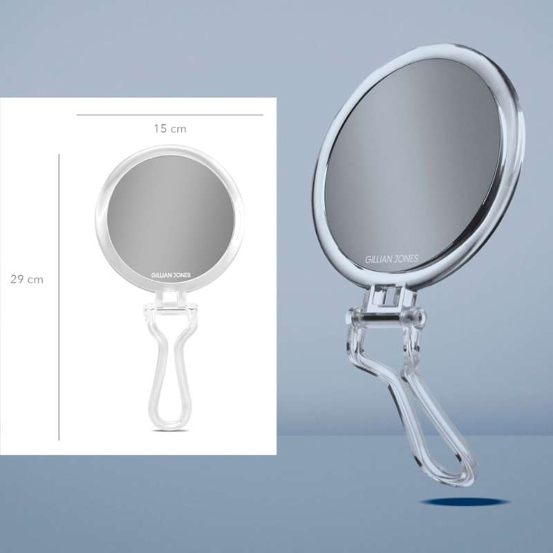 Spegeln kan användas som en handspegel med både 1x och 7x förstoringsfunktion. Du kan hänga upp spegeln på väggen med hjälp av hålet i handtaget eller "vika" handtaget för att placera spegeln på bordet i en vinkel. Spegeln har en diameter på 15,5 cm.