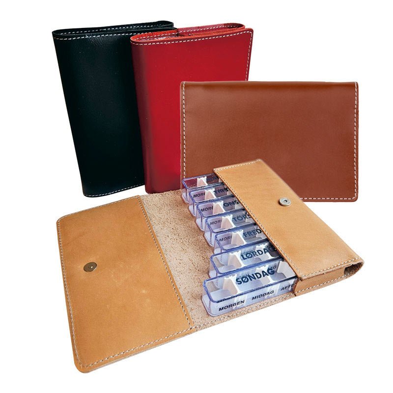 Doseringsaskarna har flyttbara skiljeväggar så att man kan justera storleken på de enskilda utrymmena efter behov. Etuiet är tillverkat i läder och finns i fyra olika färger.