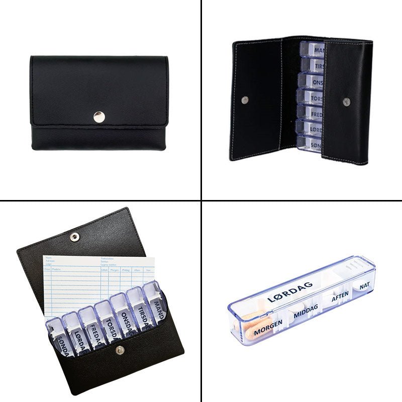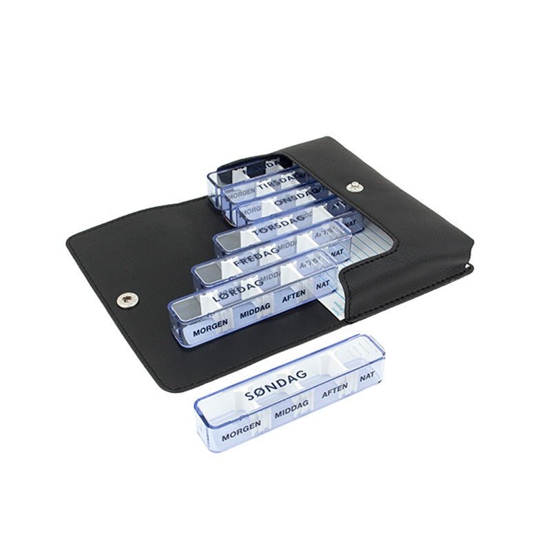 Det här fina konstläderfodralet innehåller sju askar märkta med veckodag. Varje ask har fyra fack som är märkta med tidpunkt på dygnet.