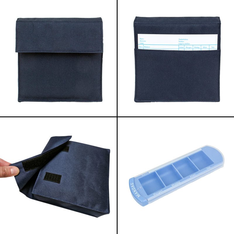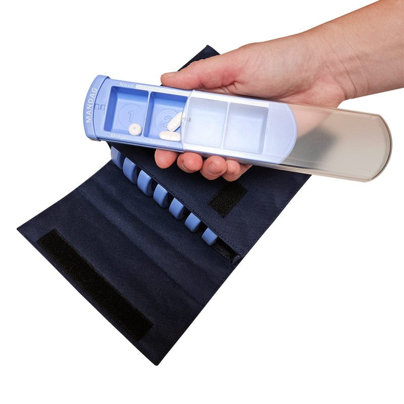 Den här Medinizer dosetten består av åtta doseringsaskar i ett praktiskt etui som stängs med kardborre. Varje enskild ask är mäskt med veckodag + en extra neutral ask.