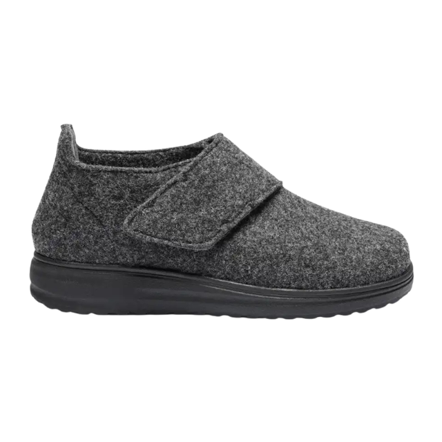 Mjuk och varm toffel med praktisk hälkappa och justerbar kardborreknäppning, så passformen kan anpassas. Ovandelen är tillverkad i slitstarkt filtmaterial som ger en bekväm och isolerande känsla.