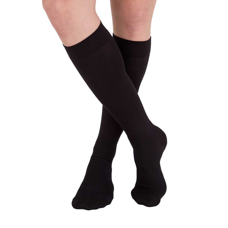 Svarta stödstrumpor från Samson (140 den) med 45% bomull – mycket skonsamma mot huden. Bomullsfibrerna sitter på insidan av strumpan, så de ligger direkt mot huden. Detta ger en behaglig känsla och gör det lättare för fukt att transporteras bort.