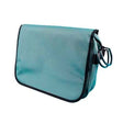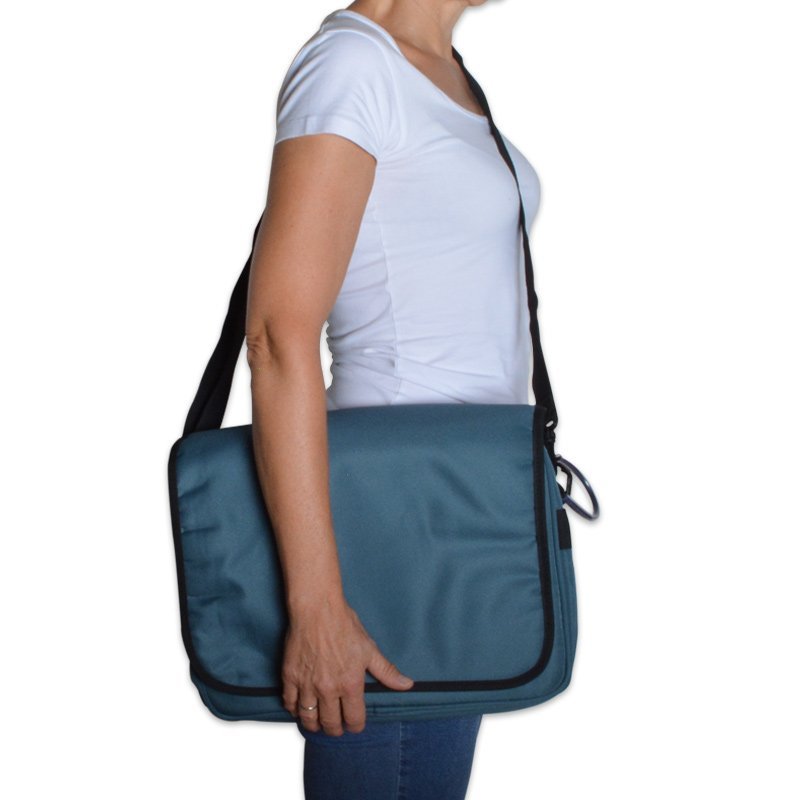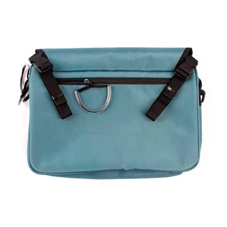 Rymlig axelremsväska i fin blå färg som är designad för att användas tillsammans med en rullstol eller rullator. Väskan kan hängas på rullatorns ram eller på rullstolens körhandtag.