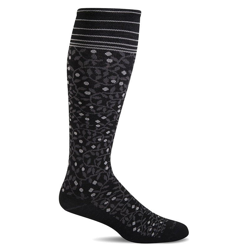 Medicinsk kompressionsstrumpa med svart mönster för damer. Denna typ av strumpa rekommenderas exempelvis vid svåra åderbråck, lymfödem, efter operation eller för mycket trötta ben.