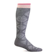 Grå stödstrumpa/kompressionsstrumpa med blommönster för damer, i en blandning av merinoull och bambu, som minskar känslan av ömma och trötta fötter samtidigt som den ökar blodcirkulationen.