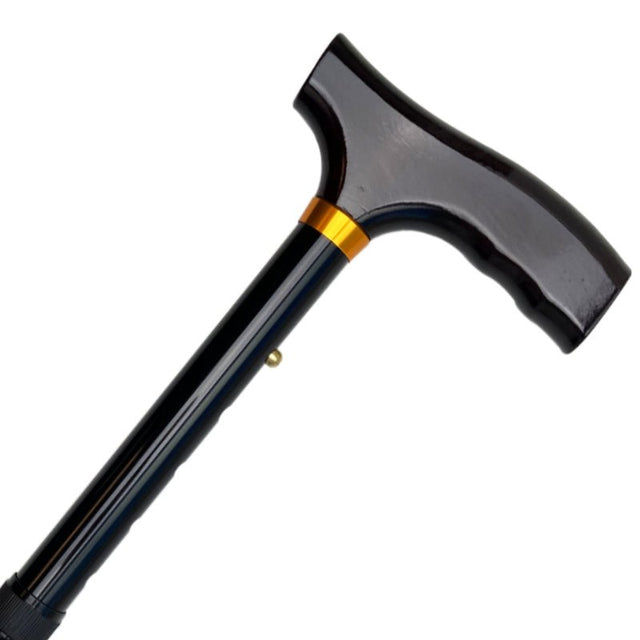 Svart käpp i aluminium med handtag i träfärgad plast och en dekorativ gyllene ring. När käppen är hopfälld mäter den endast 25 cm och ryms enkelt ryms i väskan.