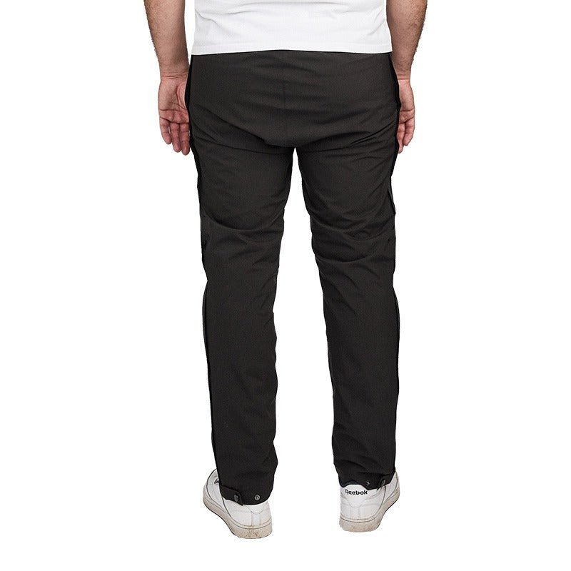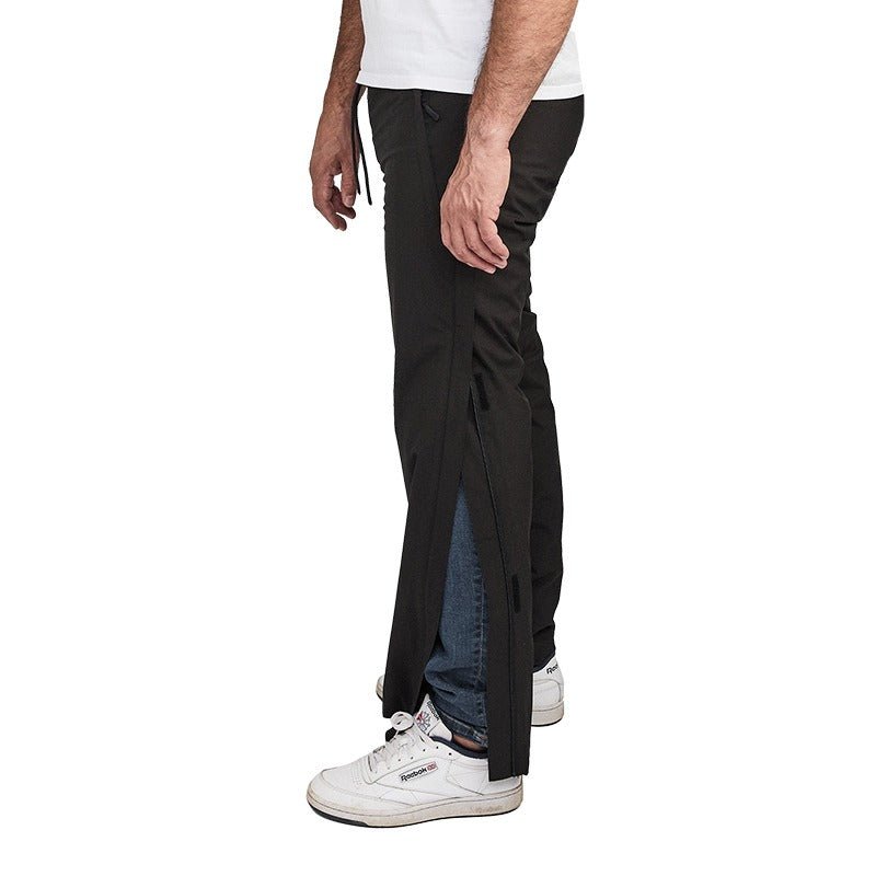De långa genomgående dragkedjorna på båda sidor – från midja till fot – gör byxorna enkla att ta av och på.