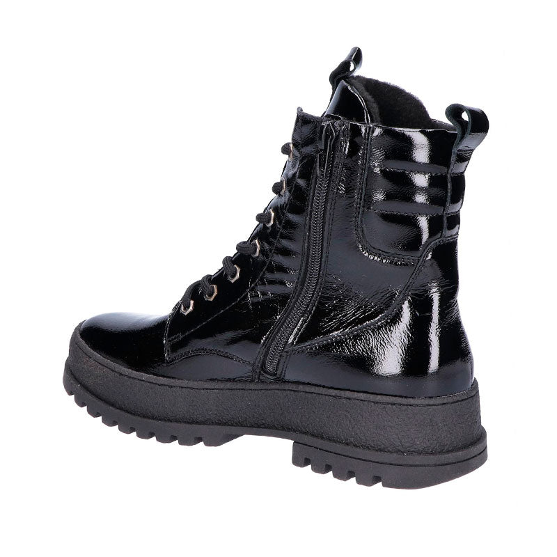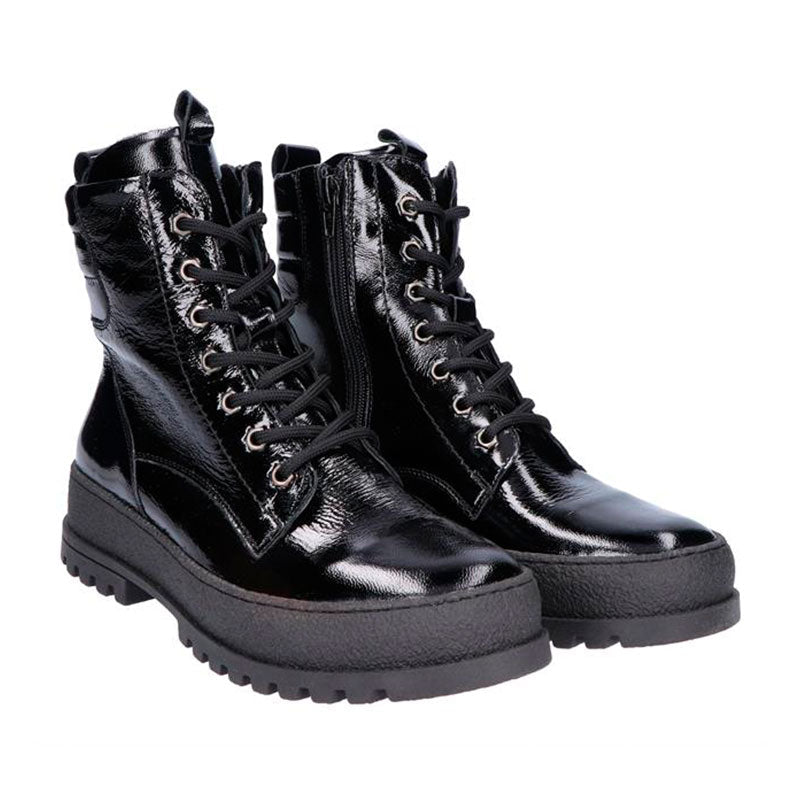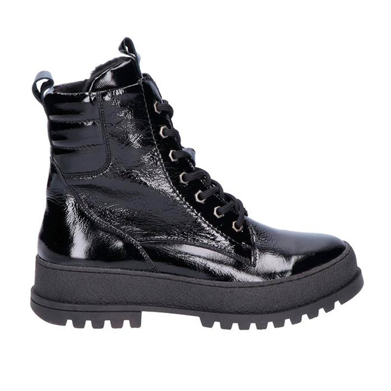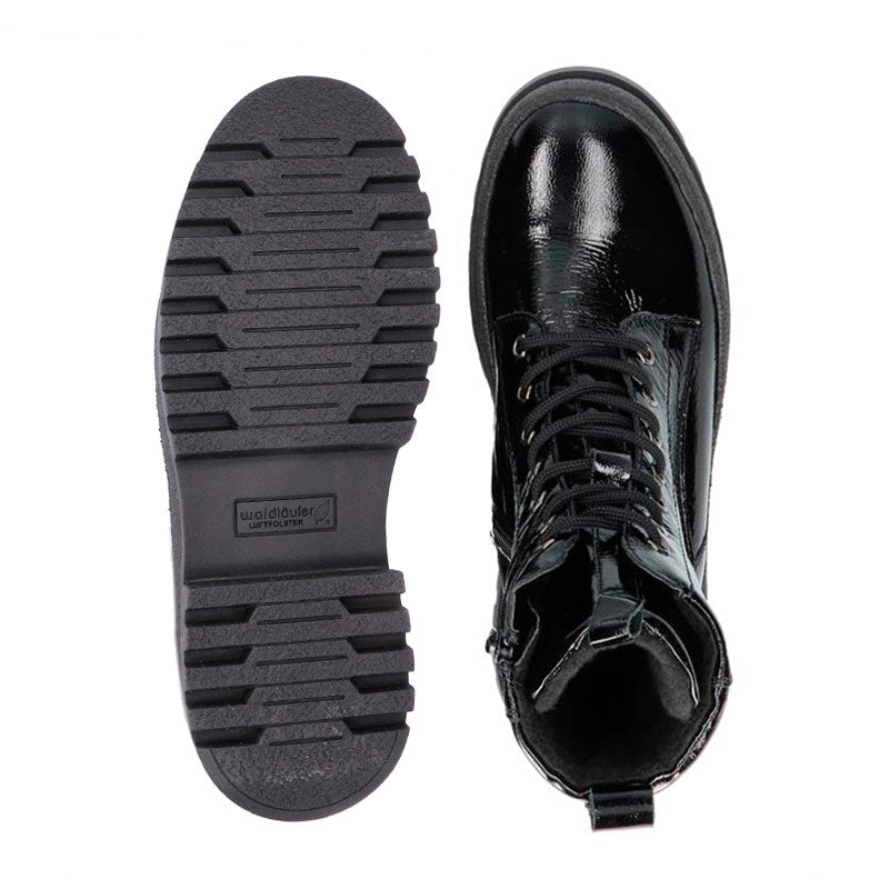 Stilren och trendig Waldläufer damkänga i glansigt patenterat läder. Kängan har en rymlig passform som ger gott om plats för tårna – perfekt för dig med känsliga fötter. Den är lätt och utrustad med både snörning och en praktisk dragkedja på sidan som gör den smidig att ta på och av.