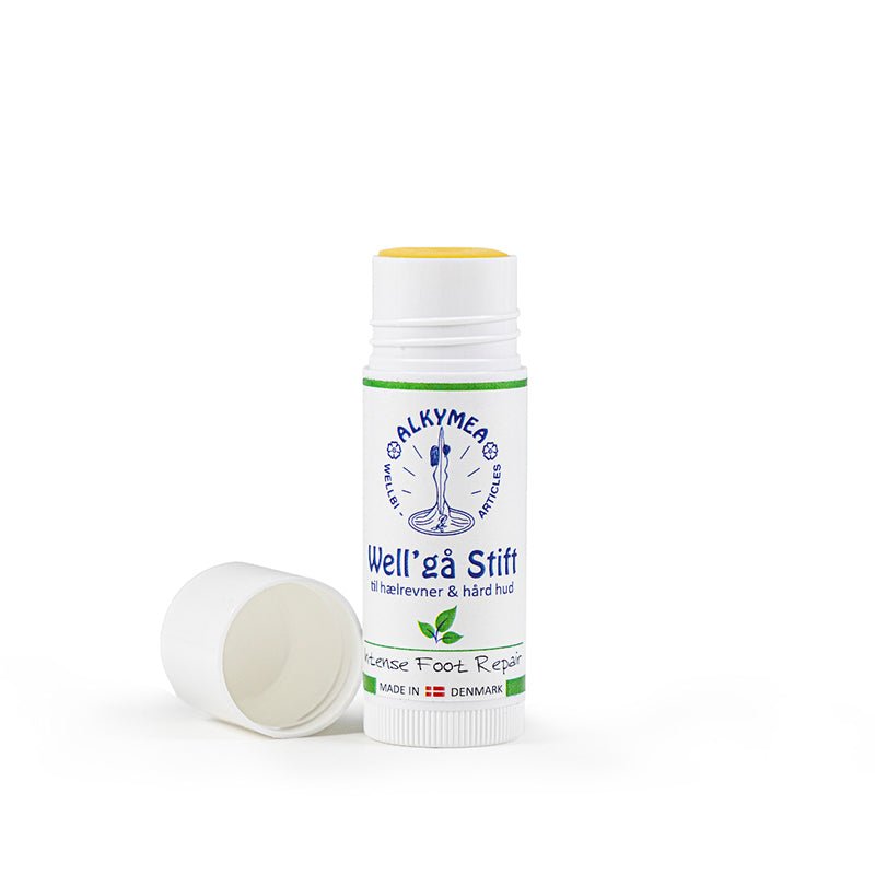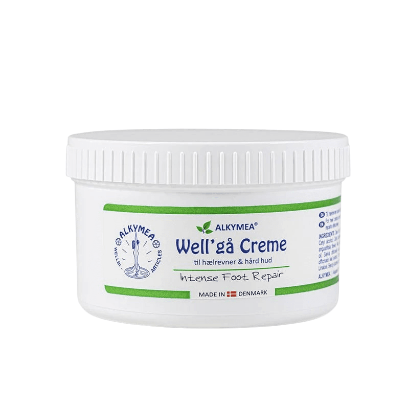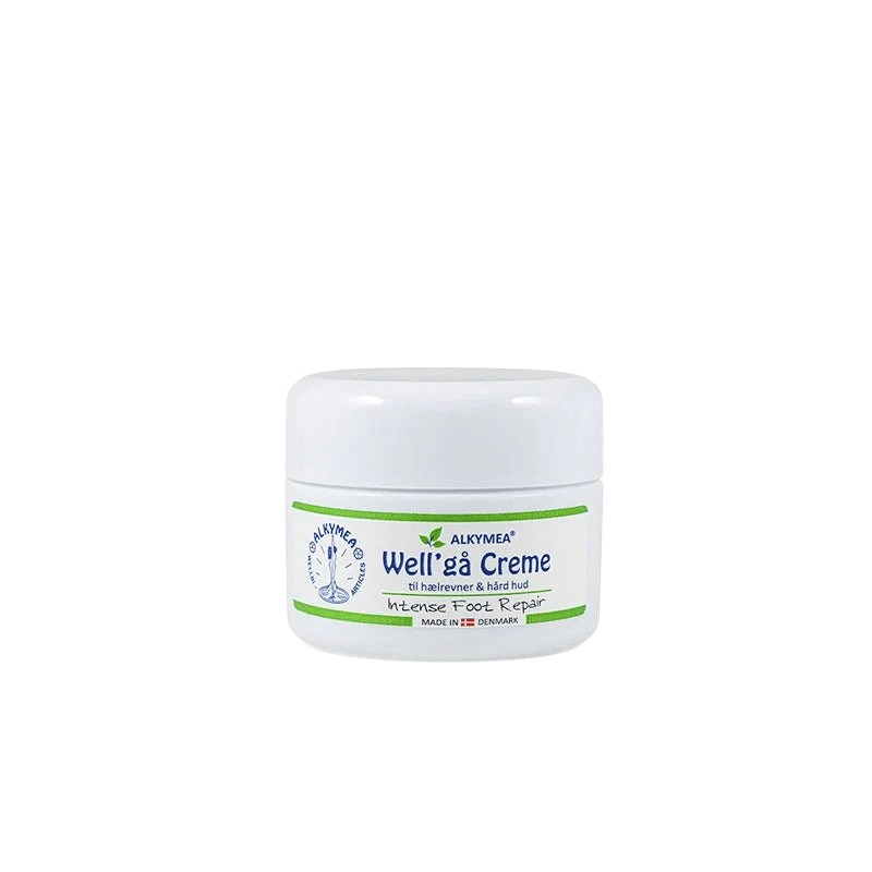 Well'gå creme till hälsprickor, hård och torr hud på fötter, armbågar och nagelband. Fast i konsistensen och lätt att applicera. Cremen har en gulaktig färg av kamomill och olivolja med svag doft av örter.