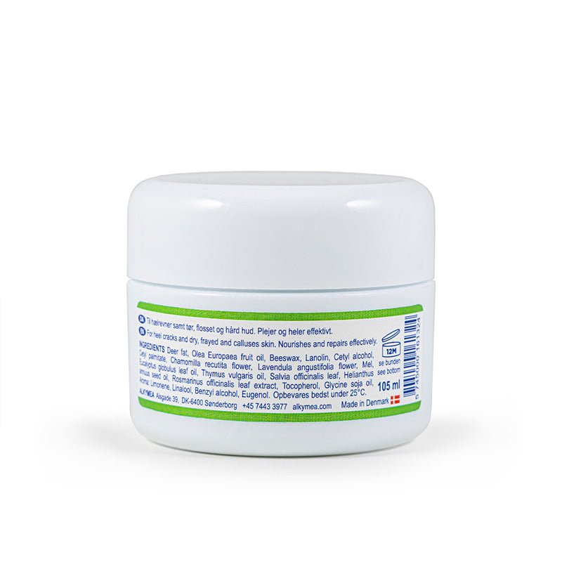 Mjukgör skonsamt så att hård hud lossnar och tillför huden extra styrka. Cremen känns inte fet utan lämnar huden silkeslen. Innehåller b.la hjorttalg, som förebygger och skyddar fötterna vid extrem belastning.